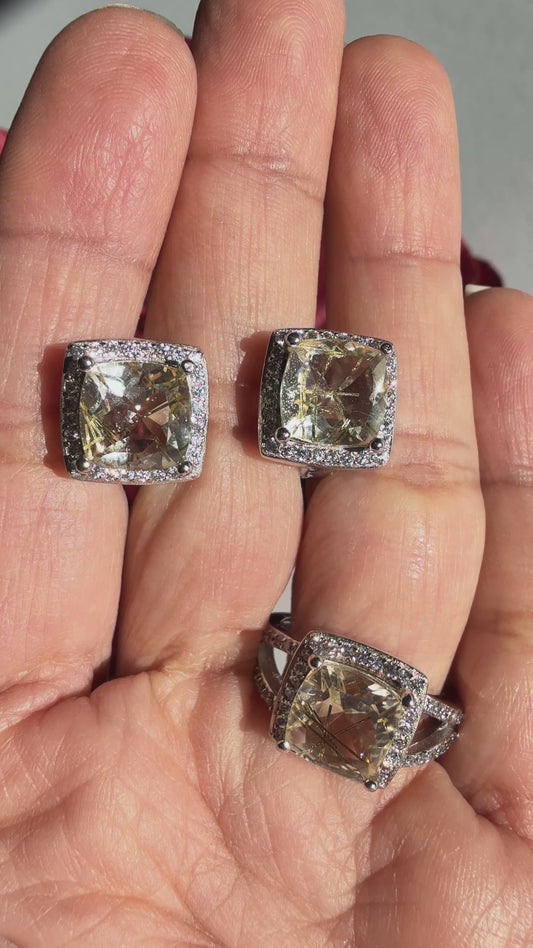 Juego de aretes y anillo talla 6, piedra natural Golden Needle