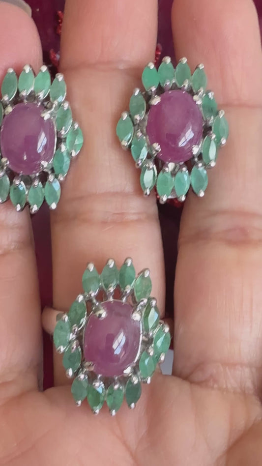 Juego de aretes y anillo Talla 8.5 en plata925 esmeraldas y rubí cabochon naturales