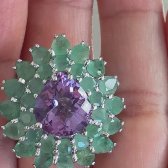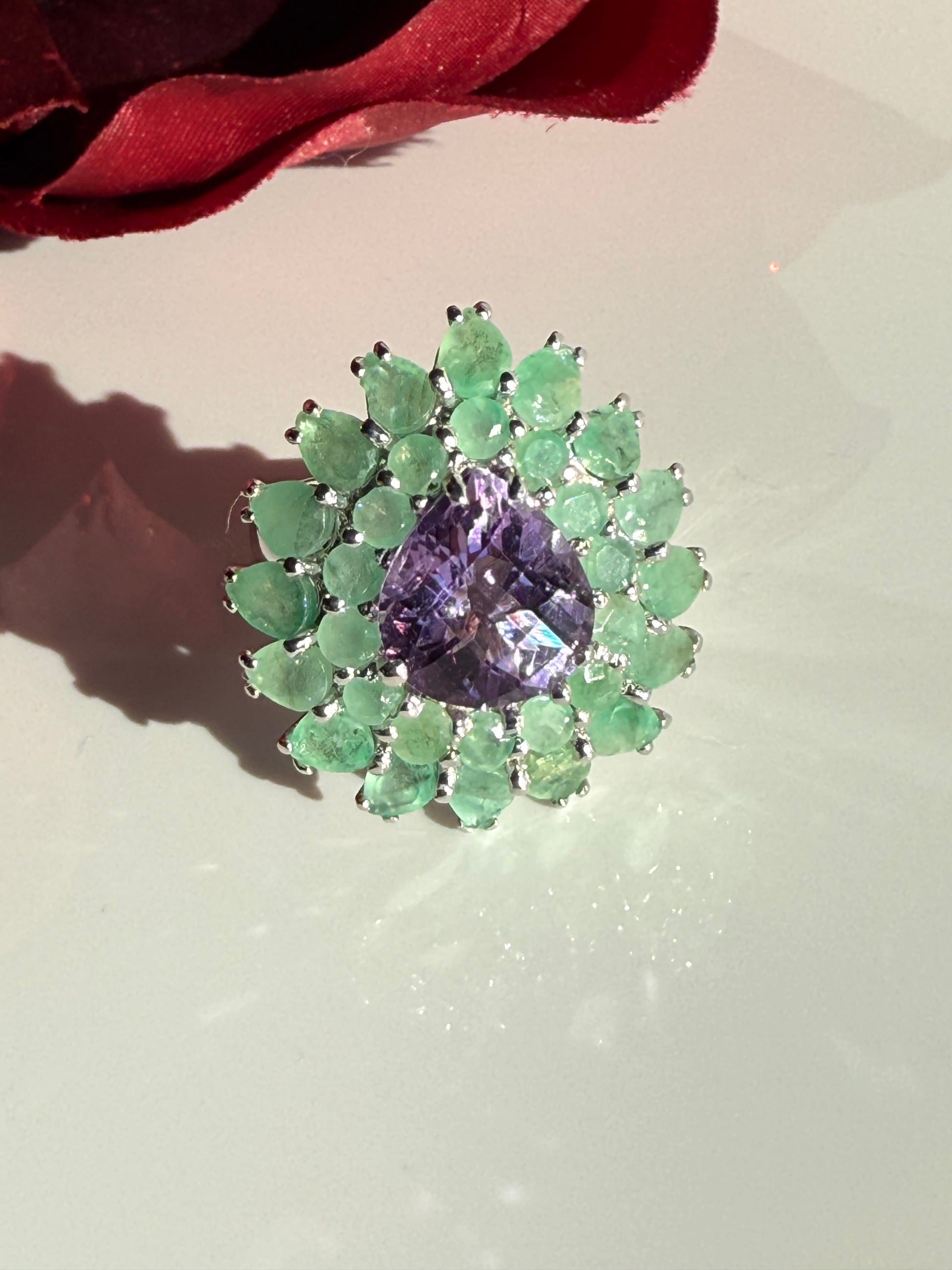 Este anillo de talla 8 está hecho de plata 925, y cuenta con impresionantes piedras de esmeralda y amatista. Logra un look sofisticado y elegante con este hermoso anillo.