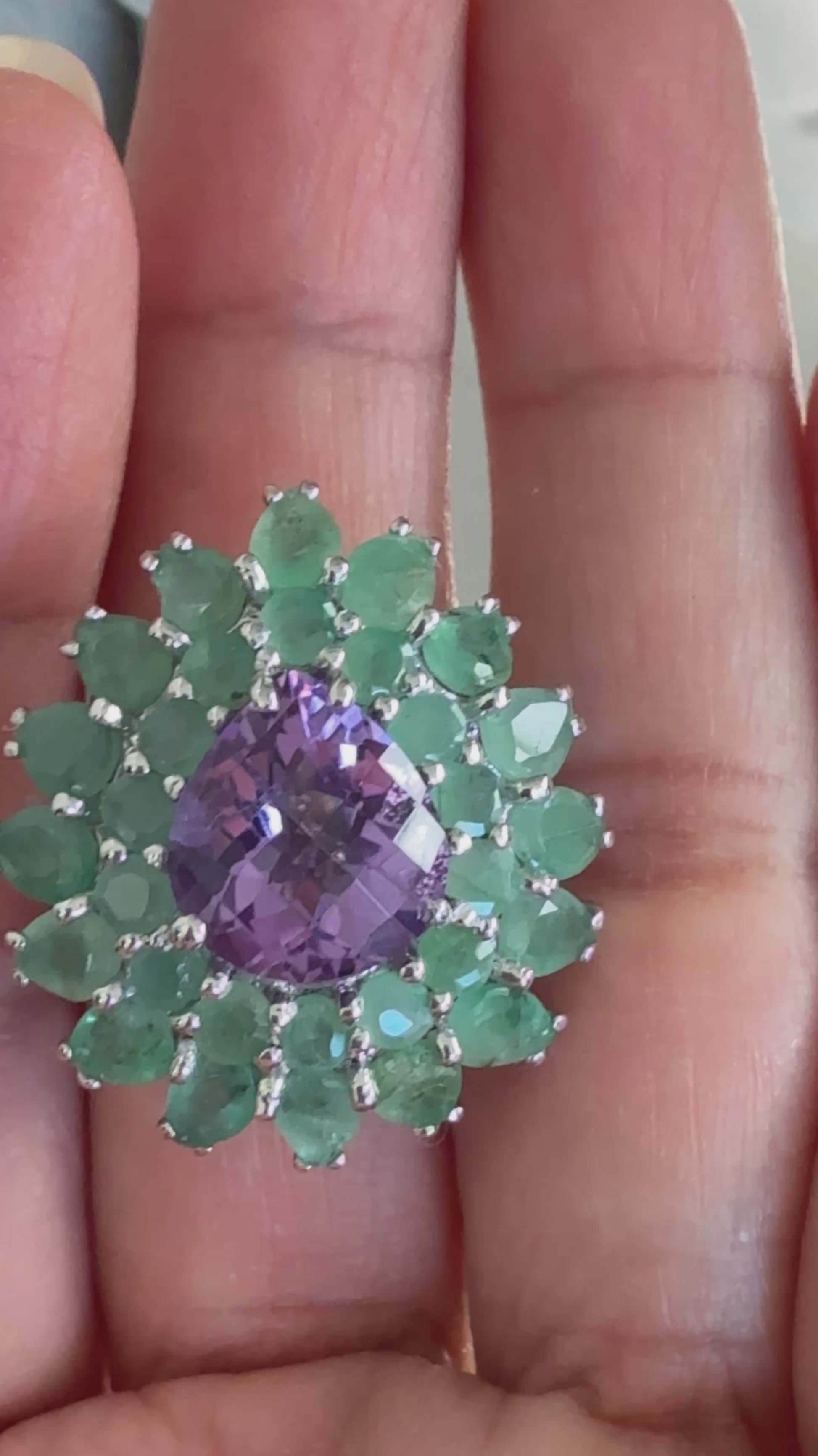 Anillo talla 8, en plata925 con esmeraldas y amatista