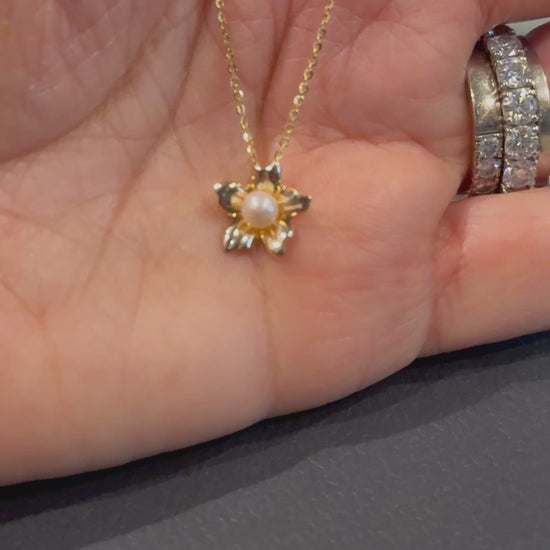 Cadena con Dije de Flor en Oro de 14k y Perlita Natural de Río