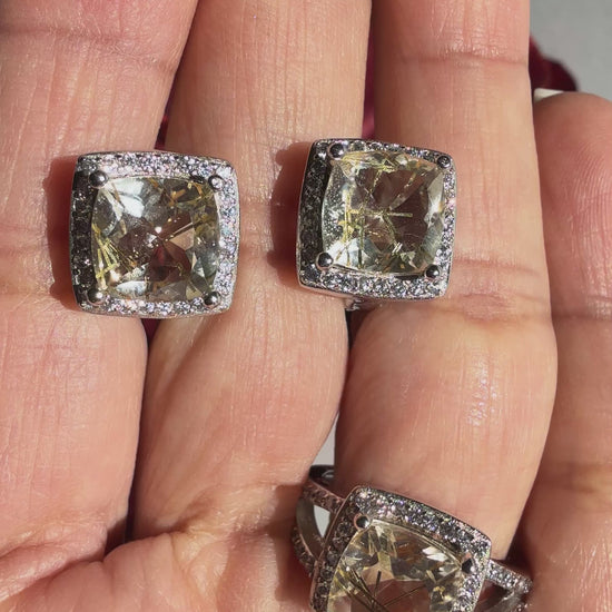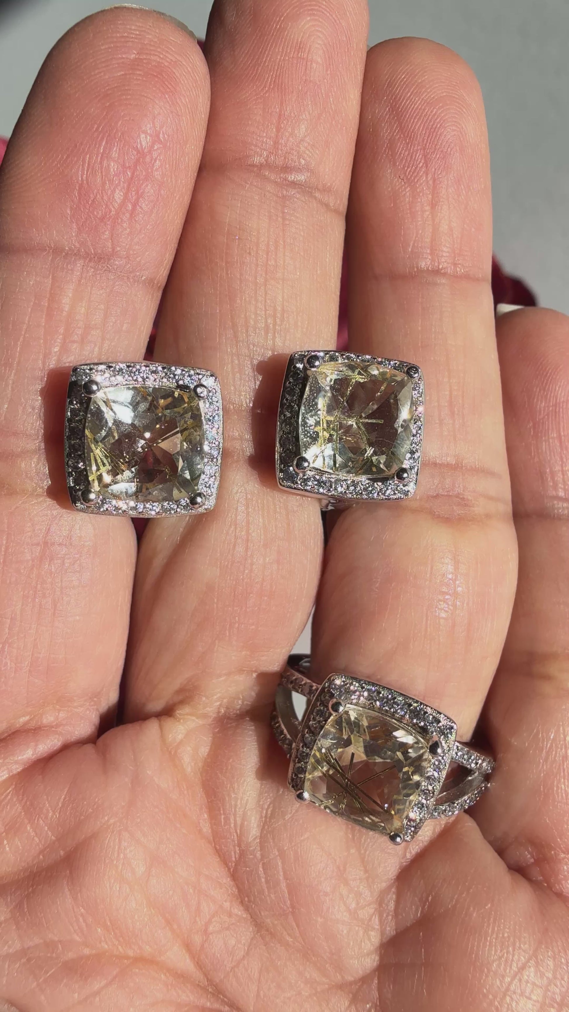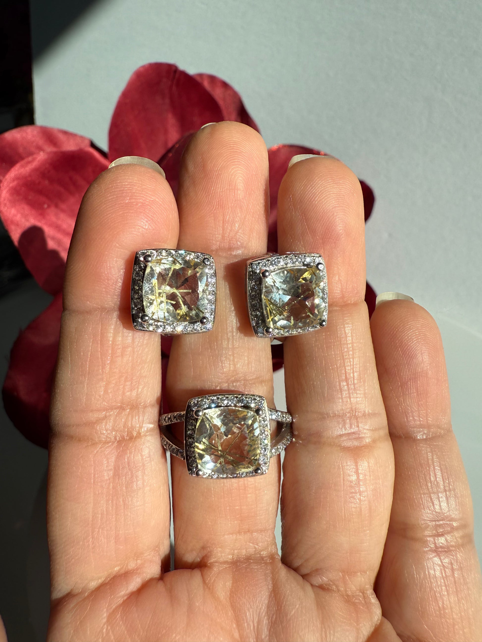 Este conjunto de joyería incluye un juego de aretes y un anillo talla 6, elaborados con la hermosa piedra natural Golden Needle. Los diseños son finos y elegantes, perfectos para complementar cualquier atuendo. Añade un toque de glamour y sofisticación a tu look con esta pieza única y de alta calidad.
