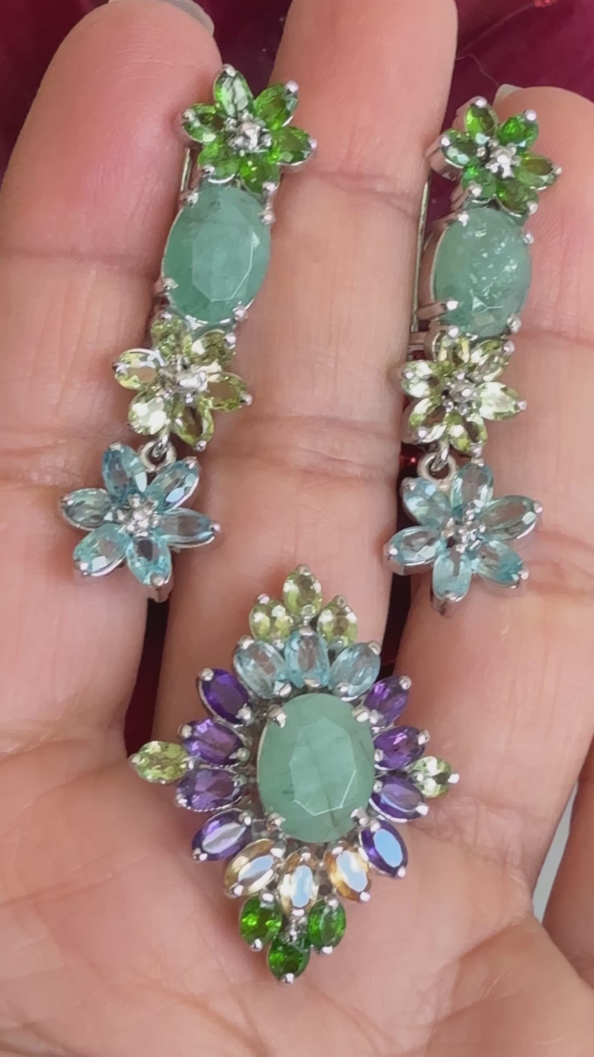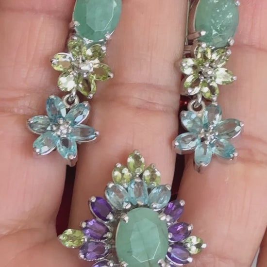 Juego de aretes y anillo talla 8, plata925 con esmeraldas, amatistas, citrinas y topacios naturales