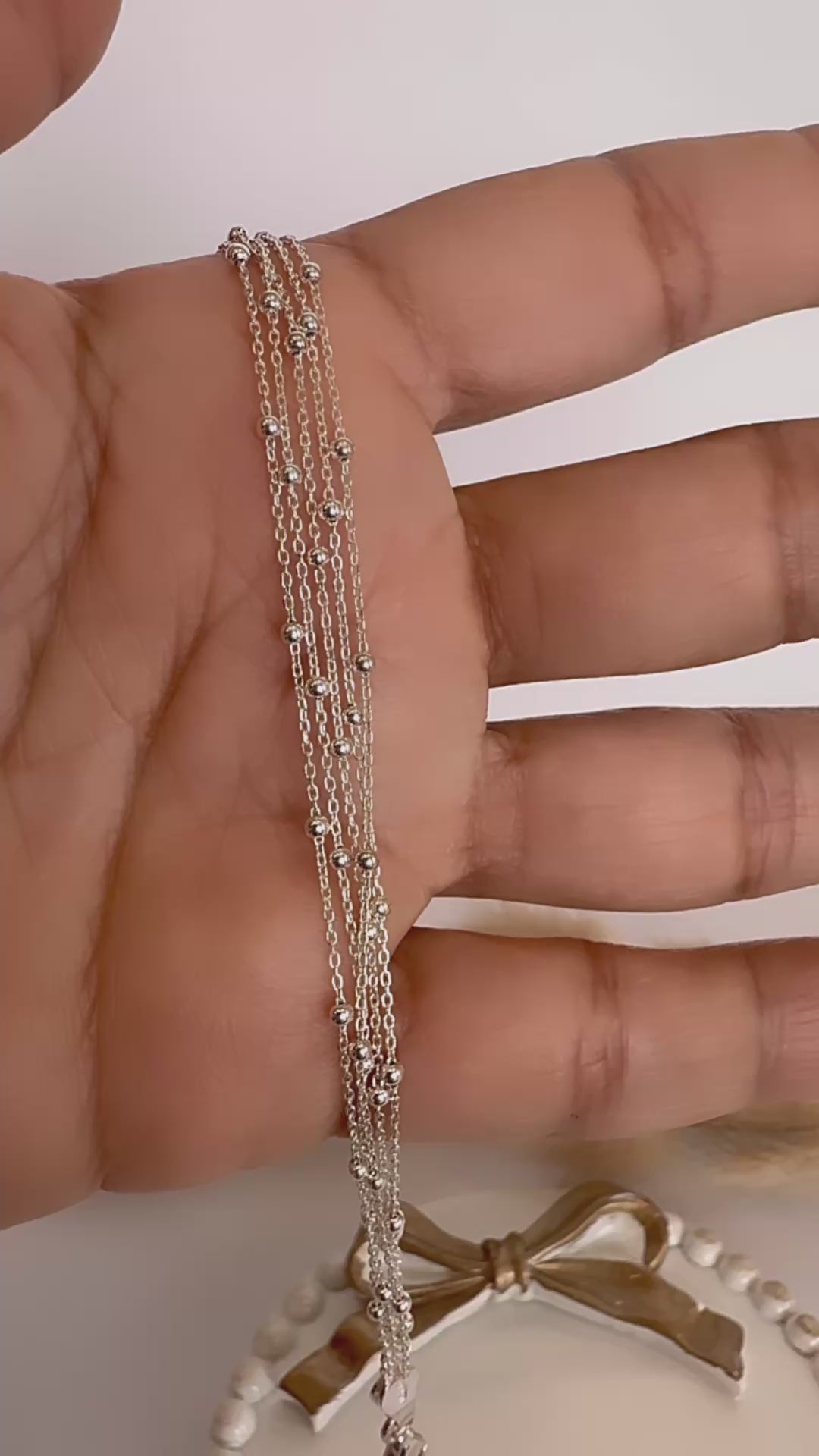 Esta pulsera de plata 925 destaca por su elegante diseño que combina cinco delicadas cadenitas con pequeñas pelotitas, aportando un toque sofisticado y moderno. Su composición en plata 925 garantiza durabilidad y resistencia, ideal para un uso diario sin perder su brillo natural. Perfecta para complementar cualquier estilo, esta pieza aporta un acabado refinado a tu look, combinando calidad y diseño con un toque contemporáneo.